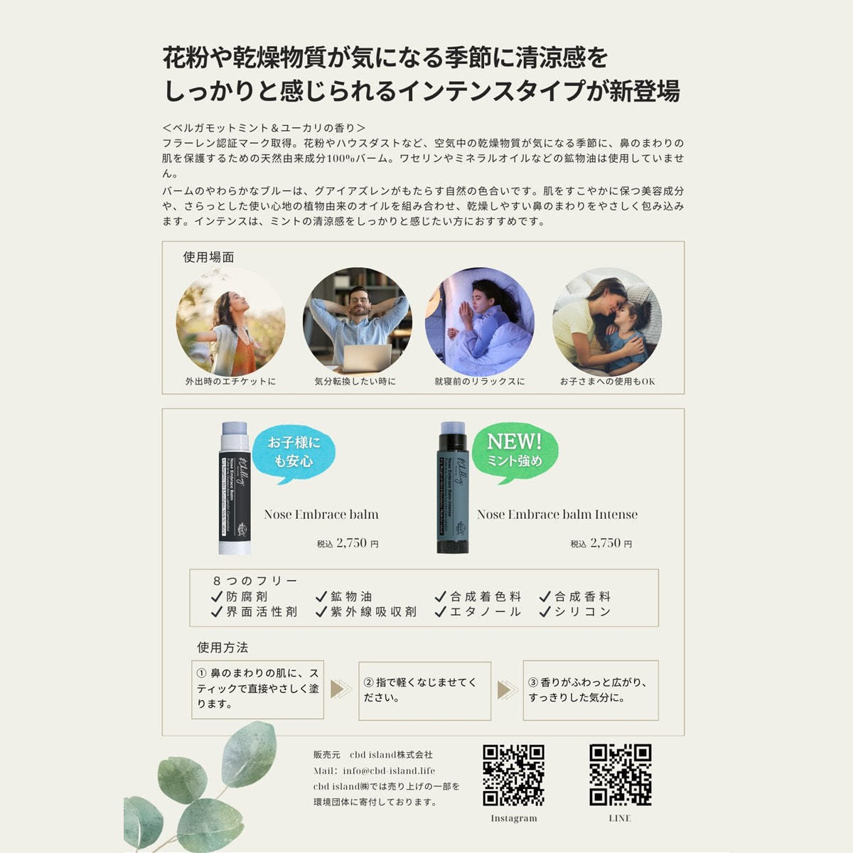 「ノーズエンブレイスバーム インテンス」は、従来品でご好評いただいていた心地よい清涼感をより感じていただけるよう、植物由来のさわやかな香りの印象と使用感をアップデートしました。